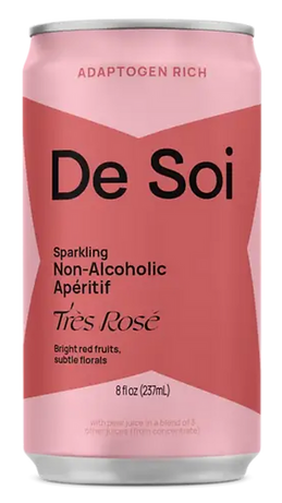 Très Rosé is a light and effervescent sparkling apéritif designed for easy sipping, with a flavor profile inspired by the elegance of rosé wine. It features bright, refreshing red fruit notes and subtle floral undertones. Like all De Soi beverages, it is infused with natural adaptogens, including lion's mane, reishi mushroom, and L-theanine. This drink offers a sophisticated, low-calorie, and zero-proof option for any occasion.